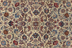 目安として、一般的なウール地の産地品は100〜200 KPSI程度が多く、カシャンや高品質のイスファハンでは300 KPSI以上に達する例もあります(ただし計測法や素材によって数値の幅は大きく異なります)。シルク地はさらに高密度が可能で、光の反射によって文様に立体感と輝きが加わります。写真でもある程度わかりますが、シルクの曲線は光の当たり方で印象が大きく変わるため、実物での確認が有効です。