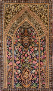 アーチ状の形(ミフラーブ:礼拝の方向を示すニッチを図案化したもの)や、根から上方へ枝を広げる生命の樹など、明確な上下の方向性がある。180度回転すると意匠の意味が変わるため、向きを意識して鑑賞する必要がある。礼拝用絨毯(プレイヤーラグ)に多く見られる構図。